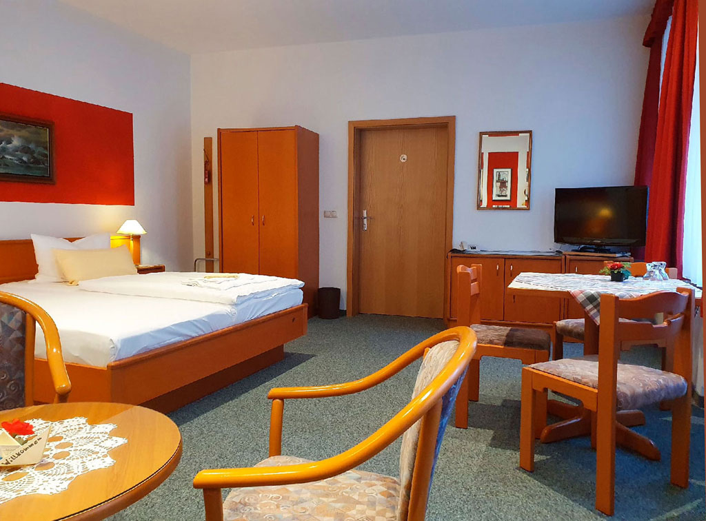 Unsere Appartements sind alle individuell gestaltet und zwischen 34 und 42 m² groß und alle mit Dusche/WC ausgestattet. In den Zimmern erwarten Sie ein Doppelbett mit zwei getrennten Federkernmatratzen mittlerer Härte 90 X 200 cm (und einem extra Boxspringbett mit Federkernmatratze 80 x 200 cm in Zimmer 56). In Zimmer Nr. 55 sind die Betten nur 80 cm breit. Ein Esstisch, eine Sitzgruppe mit Couch und einem zugehörigen Couchtisch, ein Schrank, TV, Telefon und ebenso einen Kühlschrank machen Ihren Aufenthalt angenehm. Darüberr hinaus gibt es in jedem Appartemnt eine Teeküche mit Wasserkocher, Kaffeemaschine, Toaster, teilweise Mikrowelle (56, 54, 53) und einer Auswahl an Geschirr und Besteck. W-Lan ist natürlich auch hier in allen Zimmern verfügbar.